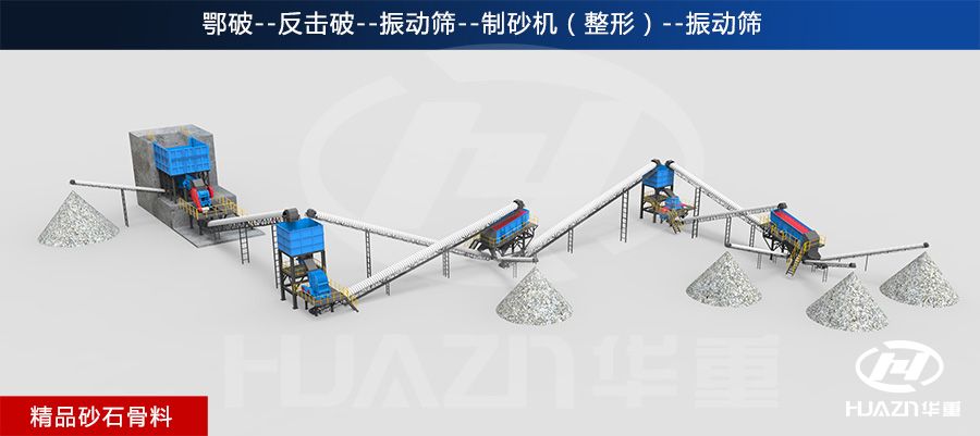 原料经给料机均匀的向颚式破碎机喂料,经颚式破碎机进行粗碎,粗碎之后用振动筛筛分,粒度较大的返回鄂式破碎机进行再次破碎,符合粒度大小的送往反击式破碎机/圆锥式破碎机进行进行中细碎,中细碎之后可再次进行筛分,能进入制砂机(5公分以下)的送入制砂机进行制砂整形,所得机制砂可用洗砂机进行清洗,之后可得干净的成品砂石骨料。